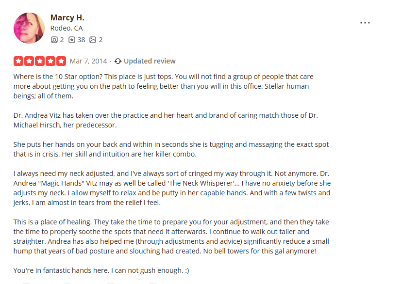 I believe that each individual’s path to wellness is unique. I take the time to carefully listen, understand your concerns, and craft treatments tailored specifically to your needs. My philosophy is about giving abilities and activities back to you, rather than creating new restrictions or taking things away.